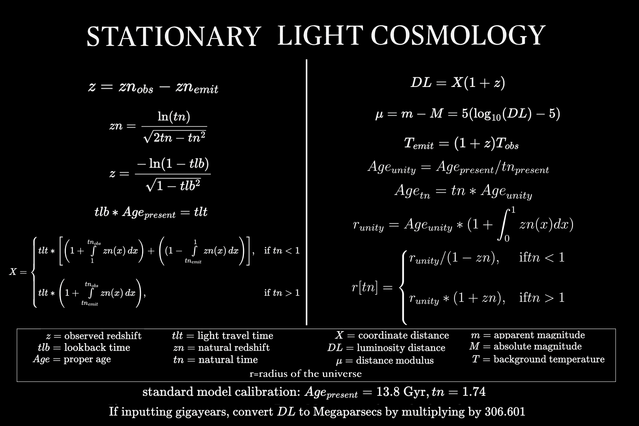 The Stationary Light hypothesis is a radical reimagining of spatial expansion. The core postulate is this: what we perceive as light travel is actually the expansion of the universe. In every moment, we are encountering the past as it radiates away from our neighbors in an expanding spacetime. Light doesn’t move— space expands. It follows that the flow of time is also tied directly to the expansion of space. The cosmological redshift is a second order effect, wherein clock-time is dilated proportionally to the elapsed age of the universe. We can derive the redshift-distance relation without any reference to matter density, dark energy, or the Friedmann equations, simply through the Stationary Light equations inputted with our present cosmic age. General Relativity is thus relegated to a local solution, describing density-based deviations from this global clock-time.